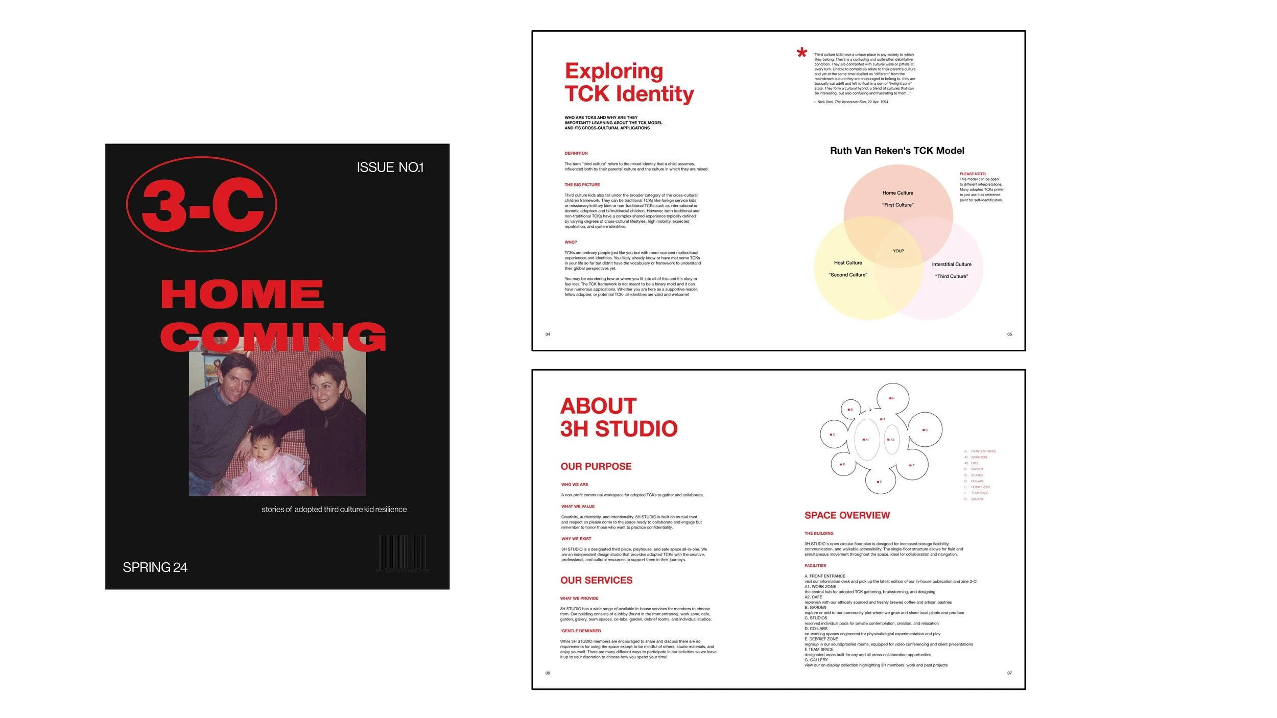 3H STUDIO and 3-C are a hybrid solution of physical and print intervention designed to reduce the isolation and confusion in the shared adopted TCK experience. They work together as a design system to provide mutual support for fellow adopted TCKs at various stages in their journeys.